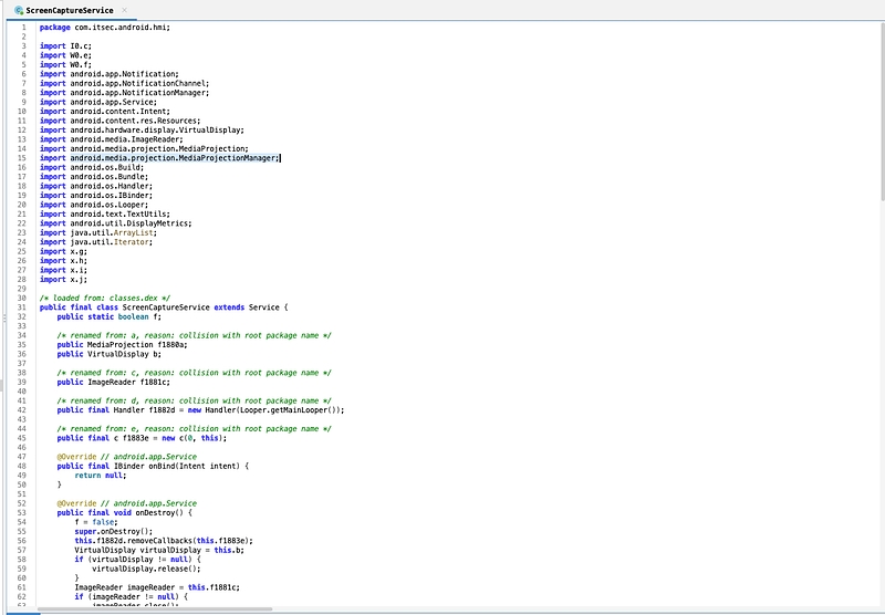 Doing some research to find Android API to capture screen, I found https://developer.android.com/reference/android/media/projection/MediaProjectionManager. So we know that the Android API used for capture victim’s screen is android.media.projection.MediaProjectionManager.