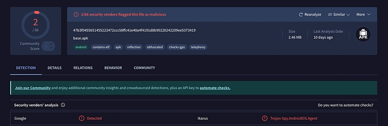 There is a lot apps in the device’s dump, but we can se the uncommon package named com.itsec.hmi. To confirm suspicions about the application, we can perform several analyses, one of which is uploading it to the VirusTotal, a free online service that analyzes suspicious files, URLs, IP addresses, and domains using a multitude of antivirus engines and URL/domain blocklisting services.