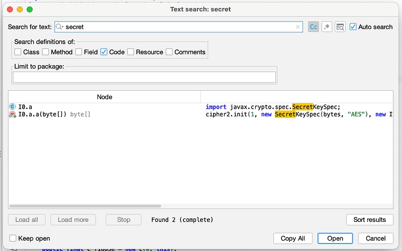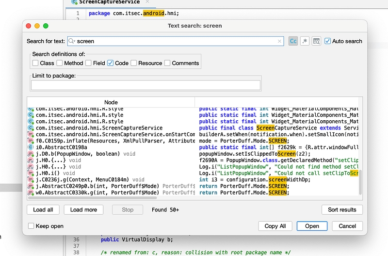 Next, we will start reversing the APK file. There are several tools that can be used for this. I’m using jadx. For the API to capture victim’s screen, we can search use cmd+shift+f and search source contains screen to narrow down to the answer.